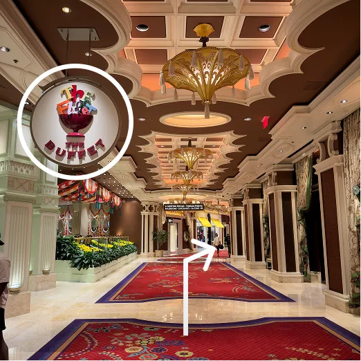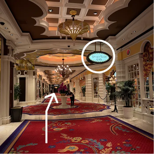 With BB Bar on your left, continue straight past The Buffet, Terrace Pointe Café, and Sartiano's Italian Steakhouse.