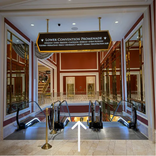 Turn left following the Lower Promenade sign. Continue straight, passing the Prosper Registration area on your right, until you reach the escalator, also on your right.