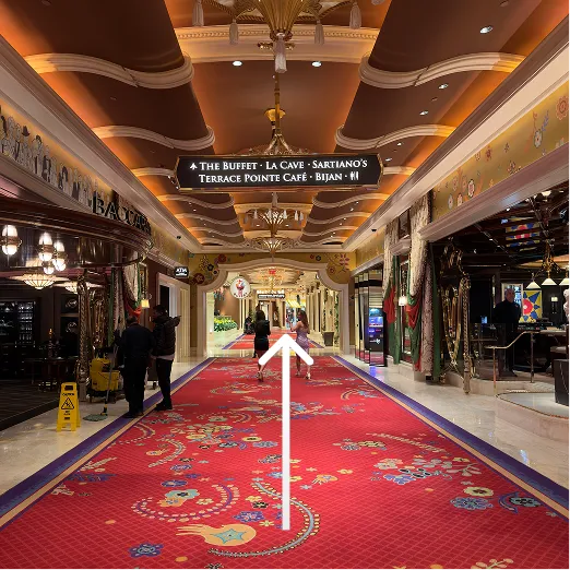 Begin at the main entrance of Wynn Hotel. Pass the mini bar and turn left into the casino. Walk straight through the casino floor until you reach BB Bar.